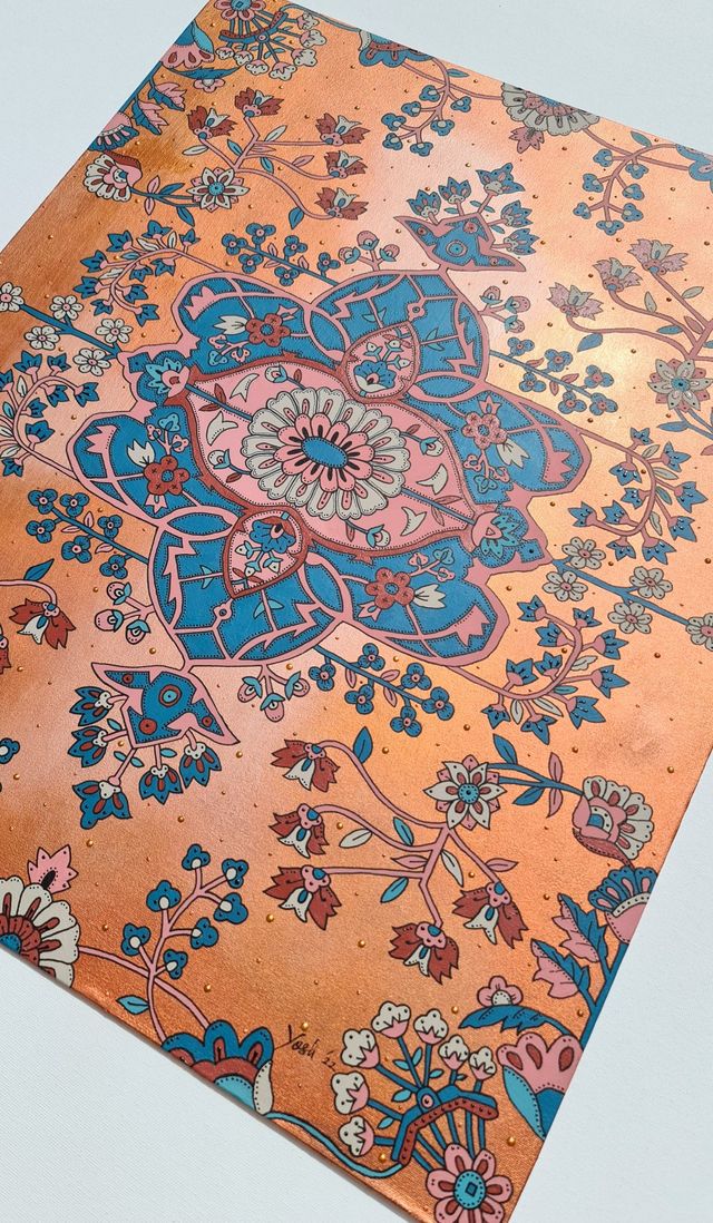 Even though the design is the middle portion of an antique Persian Sarouk rug, I have completely changed the colours. Starting from the background itself. I have used a mix of copper, bronze and rose gold for the background and pink and green shades with a barnwood shade for the design, with more details than the original.