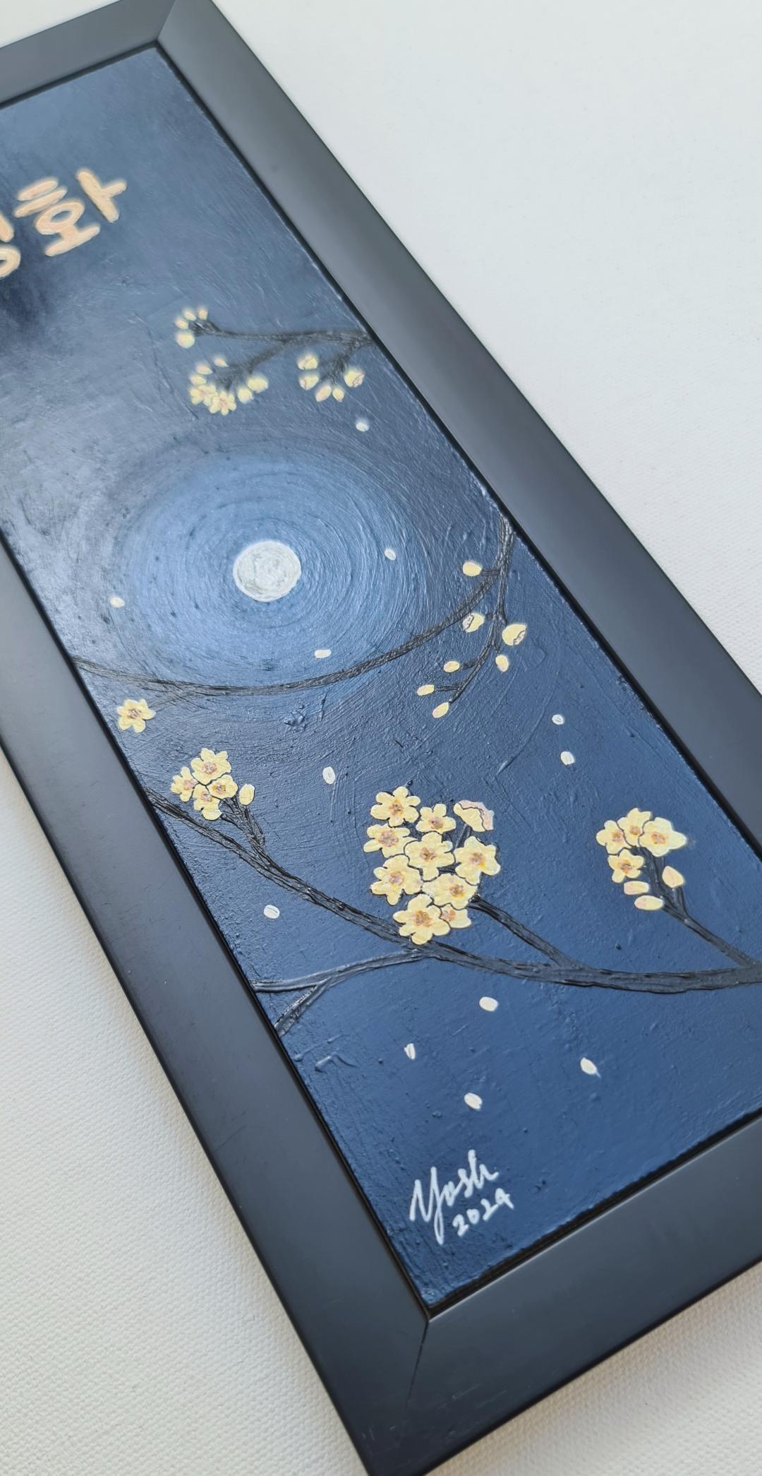 This beautiful Spring night with the full moon is made using a palette knife. The word "Peace" is written in Hangul [Official language of South Korea]