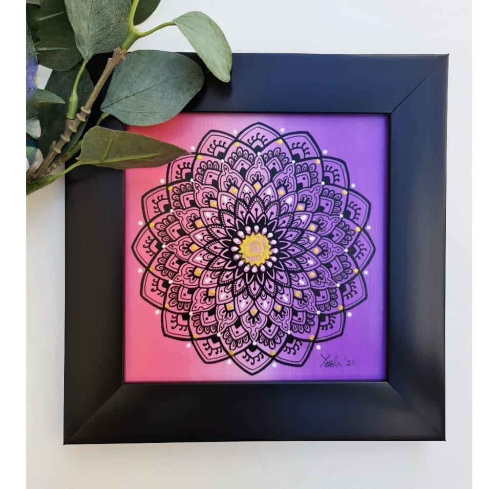 Mandala is kept in black and few simple white highlights to show the beautiful shades of pink and purple and Gold in the middle that signifies the Sun.